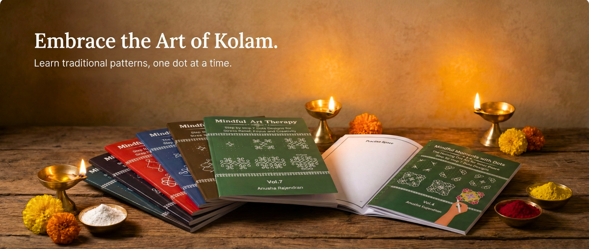 The world’s first step-by-step Kolam & Rangoli Workbooks. From simple loops to grand wedding masterpieces—draw directly inside the book!