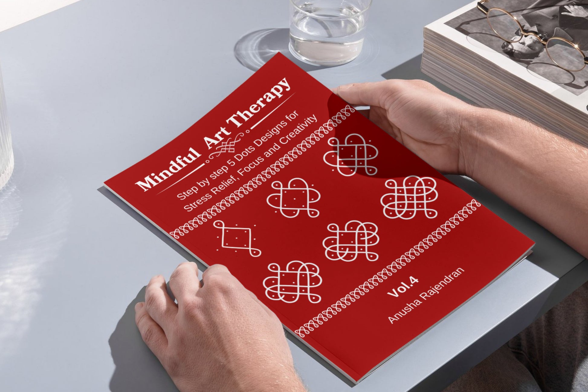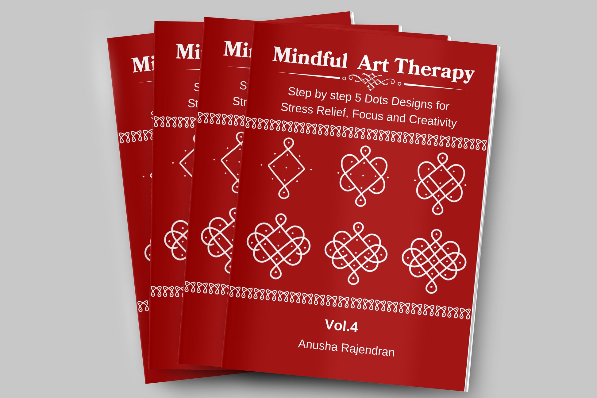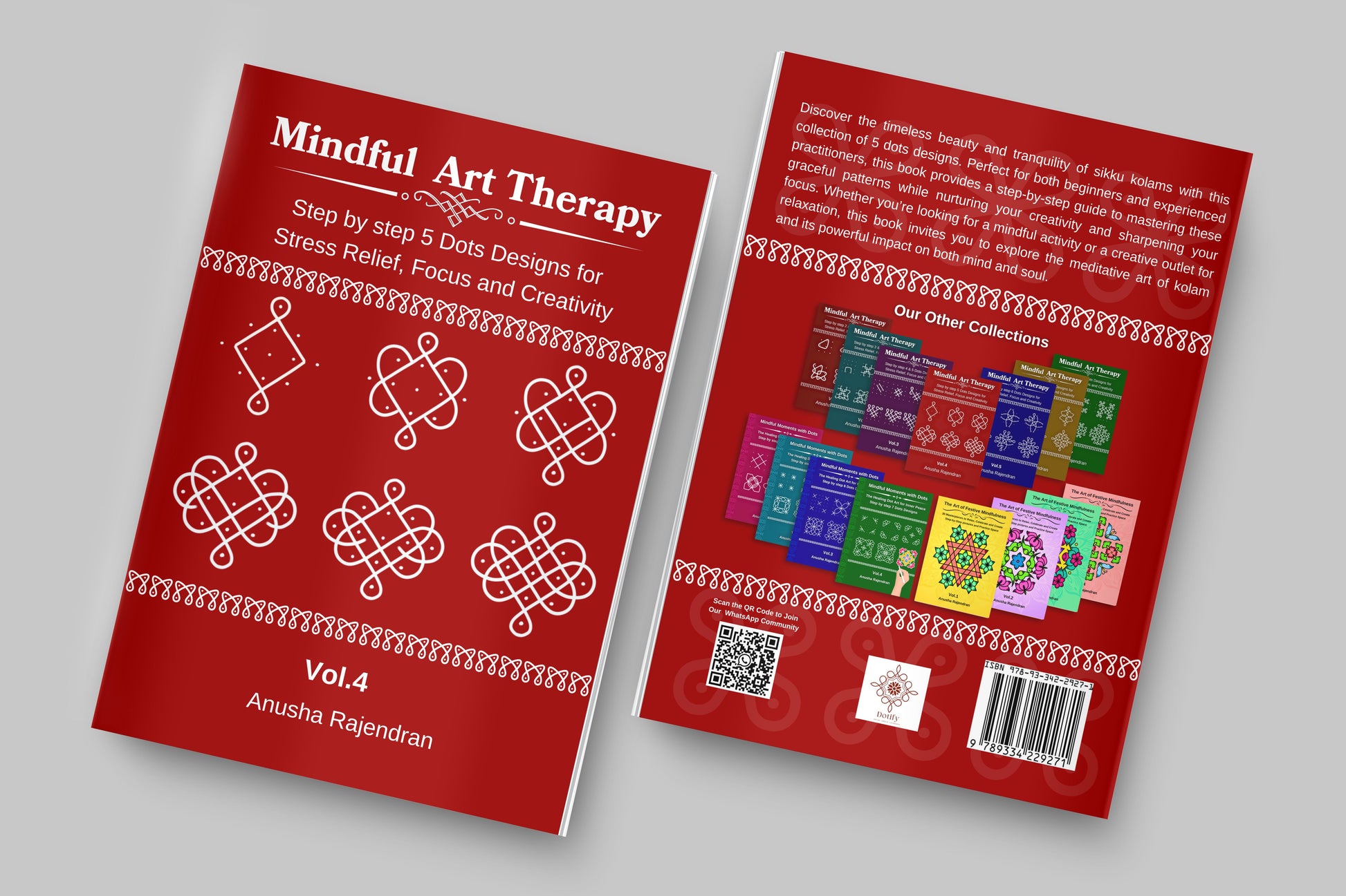 Two Styles, One Book Welcome to Mindful Art Therapy (Vol. 4), the "Red Edition" of the best-selling series by Anusha Rajendran. While Volume 3 introduced the concept of 5 dots, Volume 4 explores it in depth by teaching you the two most important grid styles in Kolam art:
