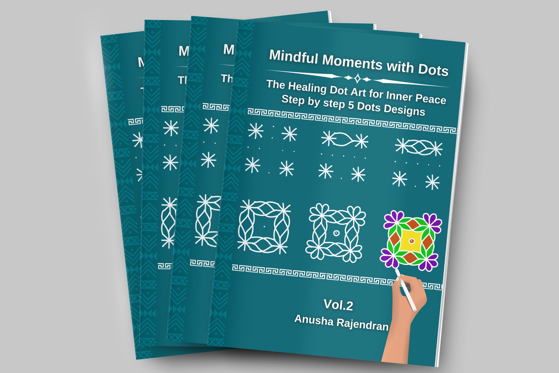 A World of Stars and Flowers Welcome to Mindful Rangoli Art (Vol. 2), the Teal Edition of the Mindful Moments with Dots series by Anusha Rajendran.